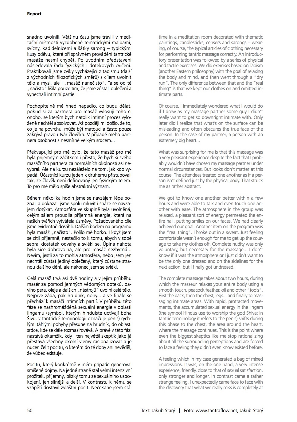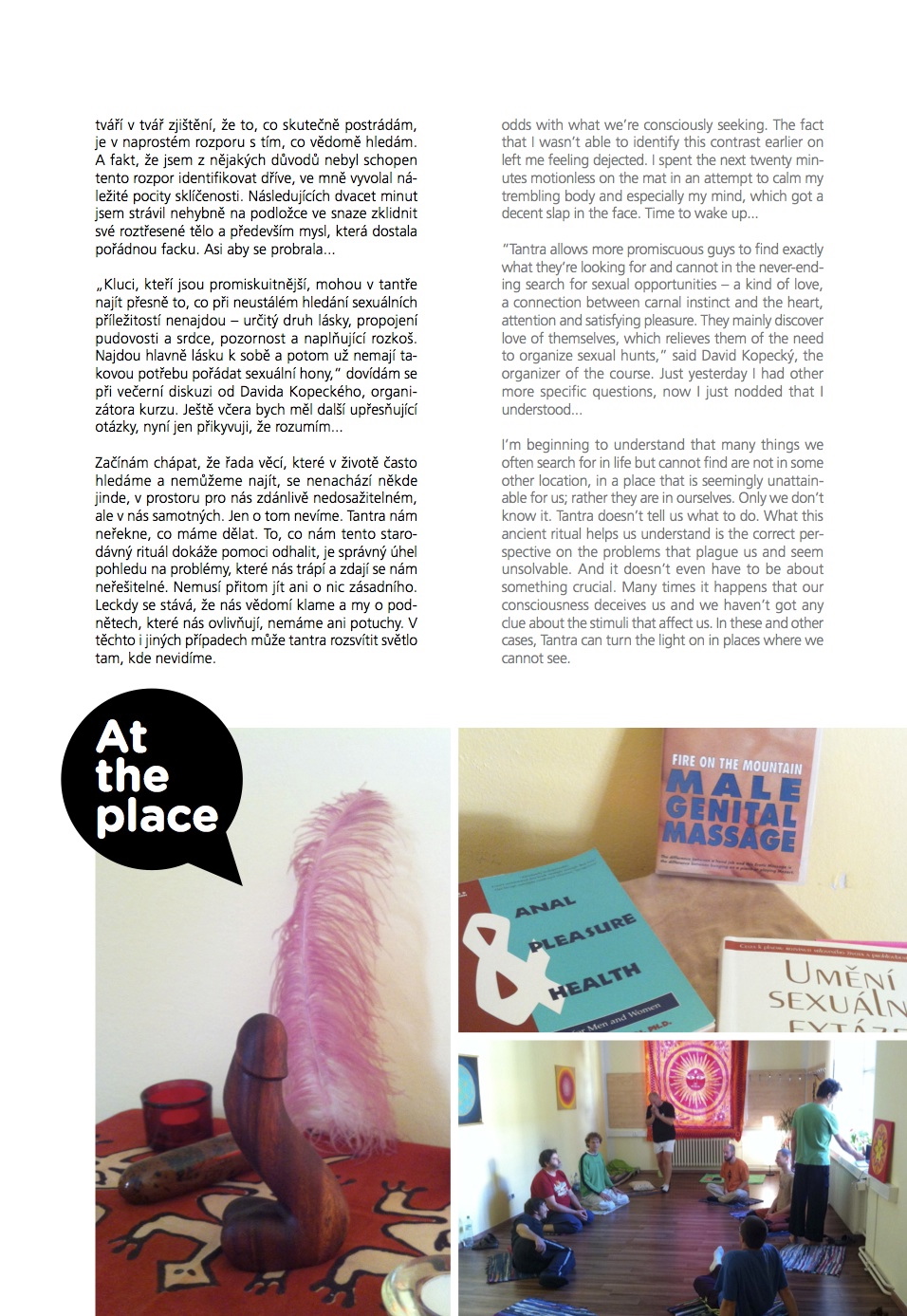 “Tantra allows more promiscuous guys to find exactly what they’re looking for and cannot in the never-ending search for sexual opportunities – a kind of love, a connection between carnal instinct and the heart, attention and satisfying pleasure. They mainly discover love of themselves, which relieves them of the need to organize sexual hunts,” said David Kopecký, the organizer of the course. Just yesterday I had other more specific questions, now I just nodded that I understood...