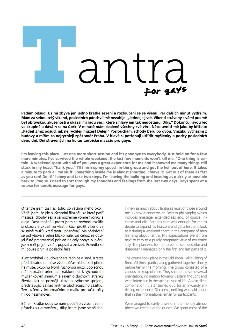 I’m leaving this place. Just one more short session and it’s goodbye to everybody. Just hold on for a few more minutes. I’ve survived the whole weekend, the last few moments won’t kill me. “One thing is certain. A weekend spent with all of you was a great experience for me and it showed me many things still stuck in my head. Thank you.” I’ll finish up my speech in the group and get the hell out of here. It takes a minute to pack all my stuff. Something inside me is almost shouting: “Move it! Get out of there as fast as you can! Do it!” I obey and take two steps. I’m leaving the building and heading as quickly as possible back to Prague. I need to sort through my thoughts and feelings from the last two days. Days spent at a course for tantric massage for gays.